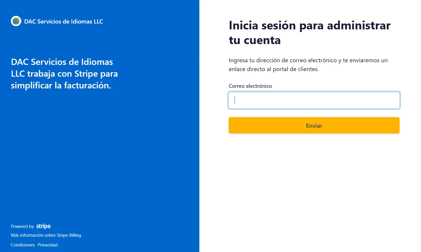 Accede al enlace “Ir al portal pagos” ubicado en la barra de opciones. Lo primero que verás es una pantalla de Stripe pidiendo el correo con el que realizaste el pago.